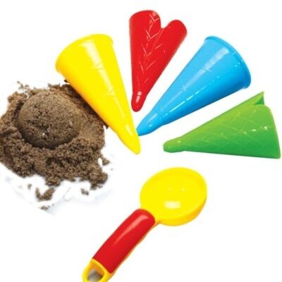 Jetzt können die Kinder leckeres Eis im Sandkasten machen. Ein spaßiges Spielzeug für den Sandkasten und auf dem Strand. Das Spielzeug besteht von vier Eistüten und einem Eislöffel.| Materialien | Plastik |